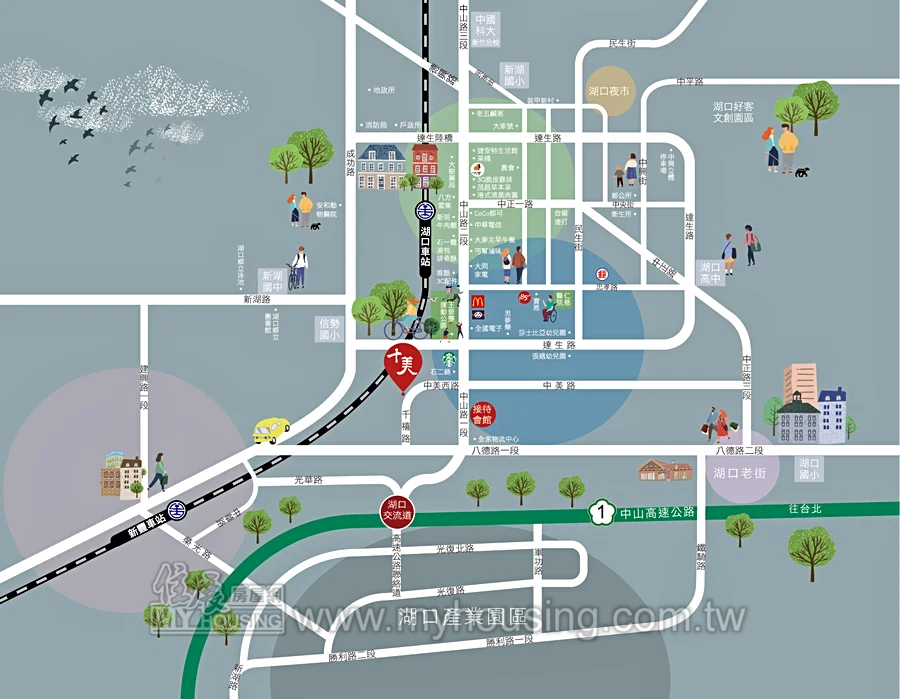基地470.6坪,距信勢國小、湖口火車站約5~6分鐘車程,規劃67戶,為2~3房,具樣品屋。