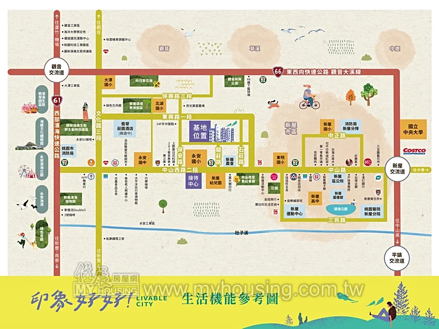 基地近永安國小,至61快速道、永安漁港約5分鐘車程。規劃電梯公寓,主推2房、彈性付款。