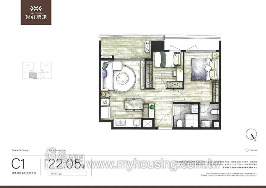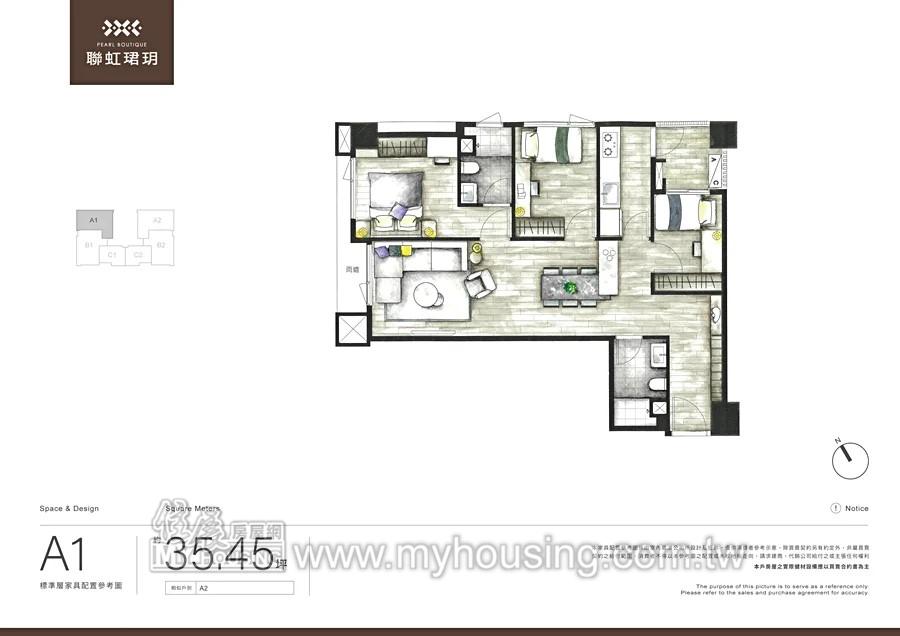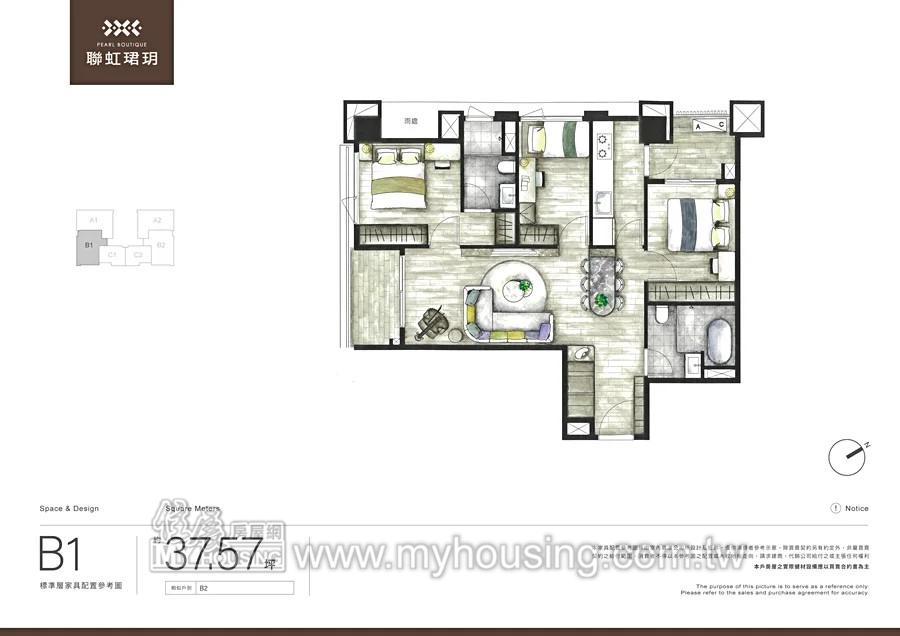 基地處新市鎮北側,距舊市區、運動中心不遠。社區為純住宅規劃、2~3房,公設比33.89%。