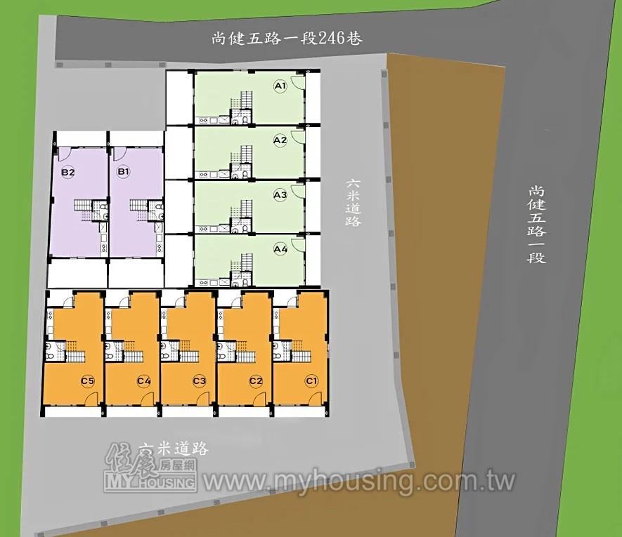 基地349.3坪,距萬富國小約2分鐘車程,規劃11戶透天,採前院停車,戶戶具獨立水塔。