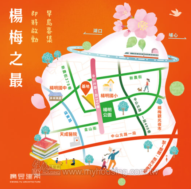 基地656.1坪,鄰近楊明公園、楊明國小,主力為2~3房,於楊新路一段308號設接待。